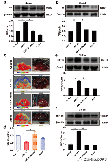 为了进一步探讨医用臭氧治疗的作用机制是否与改善肠道微环境缺氧有关,研究人员检测了缺血缺氧相关的指标。结果表明,医用臭氧可以显著抑制肠道和血液中TF的高表达。激光多普勒成像技术检测显示,化疗性肠炎小鼠的肠道血流减慢,而医用臭氧预处理可以逆转这种变化。另外,医用臭氧也可以显著抑制缺血缺氧损伤指标HIF-1α的表达。