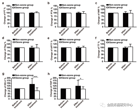 除了观察医用臭氧在整体动物水平和细胞水平的疗效,为进一步验证医用臭氧对化疗性肠炎的改善效果,研究人员筛选了62例肿瘤患者(其中35例患者未接受臭氧治疗,27例患者接受臭氧治疗)进行分析。结果表明医用臭氧自体血疗法可以有效改善肿瘤患者的化疗性肠炎,并且临床相关指标显示医用臭氧疗法可以通过减少D-二聚体和纤维蛋白原降解产物(FDP),进而降低患者的血液高凝性。
