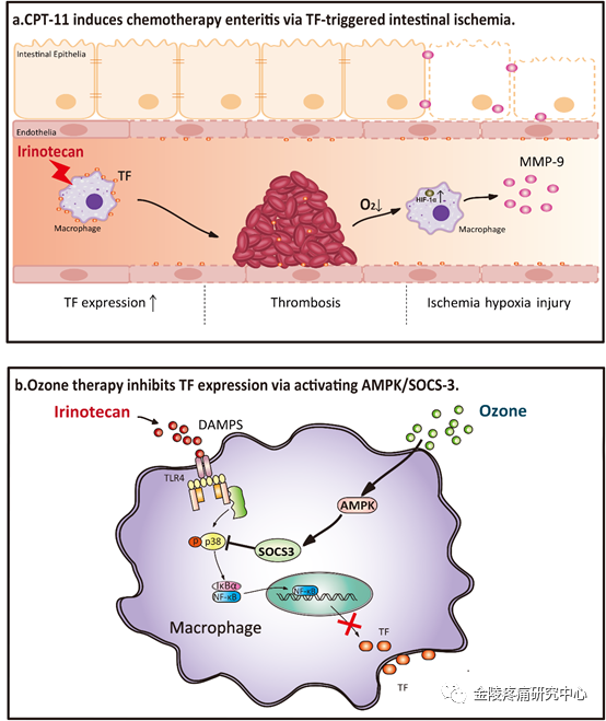 近年来,南京医科大学基础医学院疼痛研究团队和山东第一医科大学临床肿瘤专家积极展开合作,围绕着化疗性肠炎进行了前瞻性的探索。近日,题为AMPK activation by ozone therapy inhibits tissuefactor-triggered intestinal ischemia and ameliorates chemotherapeutic enteritis的论文发表于《FASEB J》杂志上。该研究首次提出TF介导的肠道缺血性损伤是诱发化疗性肠炎的核心机制,医用臭氧疗法可通过激活AMPK/SOCS3抑制CPT-11诱导的TF高表达,进而改善肠道缺血损伤,为化疗性肠炎提供了一种新的治疗策略。
