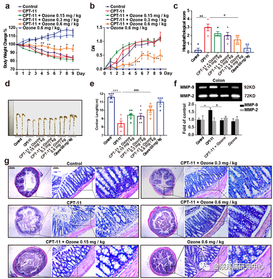 由于化疗损伤的肠道局部伴有明显缺血缺氧,研究人员探讨了医用臭氧治疗化疗性肠炎的可能性。结果发现,腹腔注射医用臭氧对CPT-11小鼠模型中的体重减轻、DAI评分的增加和肠道缩短等指标均有所缓解。HE染色结果显示,医用臭氧以剂量依赖性的方式显著减轻了肠粘膜损伤。此外,医用臭氧还可以降低肠道中MMP-9的活性。