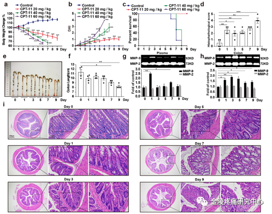 通过小鼠体重变化、DAI评分以及组织学评估,研究人员发现CPT-11(20mg/kg. i.p.)可以诱导血浆及肠道中MMP-9水平显著升高,出现肠粘膜坏死等病理性改变。
