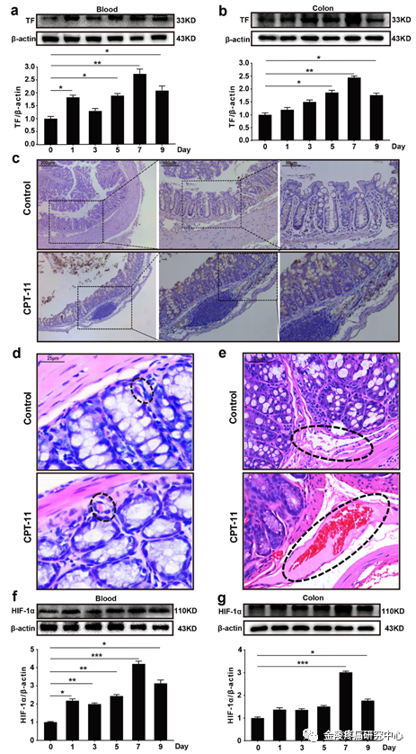 本研究证实CPT-11模型中小鼠血液和结肠中TF表达均显著升高。为了进一步确定TF在化疗性肠炎小鼠中的组织定位,研究人员对肠中的TF进行了免疫组织化学染色。数据显示,在内皮细胞,肠上皮细胞和浸润的免疫细胞上观察到TF呈现高表达。肠道HE染色结果表明,CPT-11可以诱导小鼠肠道微血栓和混合型血栓形成。与TF表达升高一致的是,缺血缺氧损伤相关指标HIF-1α的表达也经CPT-11诱导上调,提示CPT-11诱导的血栓形成与TF、HIF-1α高表达是正相关。