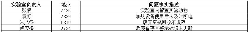 9月学院对各学系、中心实验室及学生学习室进行安全检查,多数学系、中心实验室安全状况良好,但部分实验室存在加热设备使用后未及时断电、危废暂存区警示标识未更新、消防记录卡及实验室自查表未及时更新等问题,现将具体情况通报如下: