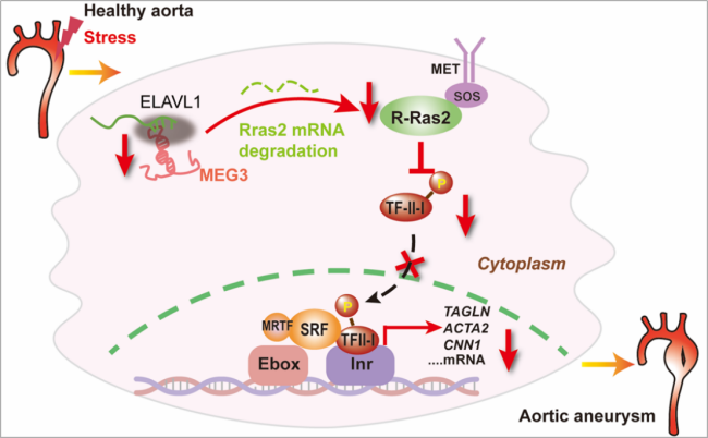 Ras信号是整合素与TGFβ信号转导通路下游的关键节点,其是否能够影响血管平滑肌细胞表型转化并参与主动脉瘤,目前尚不清楚。本研究基于腹主动脉瘤患者血管组织及动物样本,通过多组合联合分析进一步筛选发现RRAS2是参与主动脉瘤相关平滑肌表型转化的核心基因。而平滑肌特异性敲除RRAS2可促进平滑肌表型转化,从而加重腹主动脉瘤的发生。进一步机制研究表明,RRAS2 介导c-Met依赖的转录因子TFII-I的磷酸化及核转位,激活平滑肌收缩相关基因的转录表达,进一步研究发现长链非编码RNA MEG3通过抑制Rras2 mRNA降解,维持血管平滑肌细胞稳态,延缓腹主动脉瘤的进展。研究成果为临床干预提供了具有重要转化价值的新策略。