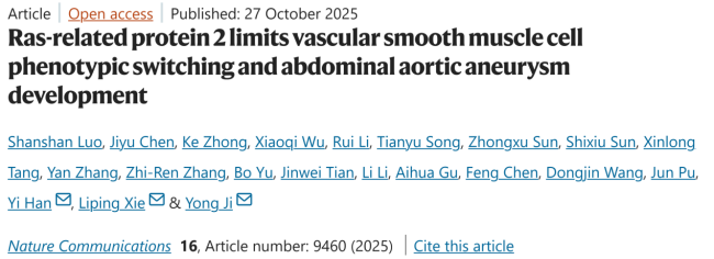 近日,我校季勇、谢利平团队在国际权威期刊《自然·通讯》(Nature Communications)上发表了题为《Ras相关蛋白2抑制血管平滑肌细胞表型转换及腹主动脉瘤》(Ras-related protein 2 limits vascular smooth muscle cell phenotypic switching and abdominal aortic aneurysm development)的相关研究。该工作系统分析了不同Ras家族成员在血管平滑肌细胞表型转化中的表达及变化情况,揭示了Ras相关蛋白2(RRAS2)通过维持血管平滑肌细胞收缩表型,改善腹主动脉瘤的作用及其具体分子机制,为临床治疗提供了具有转化潜力的干预靶点。