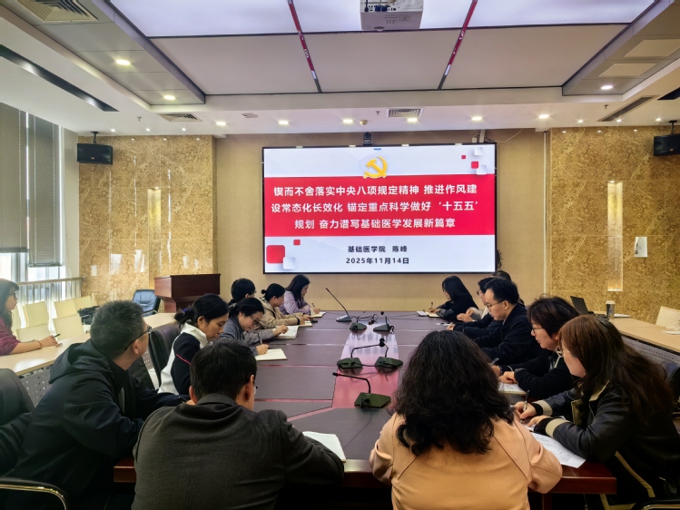 11月14日,基础医学院陈峰书记以“锲而不舍落实中央八项规定精神 推进作风建设常态化长效化 锚定重点科学做好‘十五五’规划 奋力谱写基础医学发展新篇章”为主题,在学海楼A435会议室为全体党支部书记讲授专题党课,凝聚思想共识,明确发展方向。