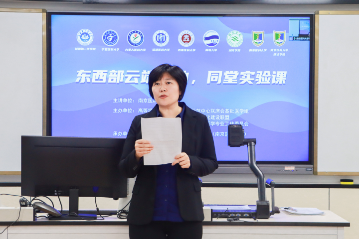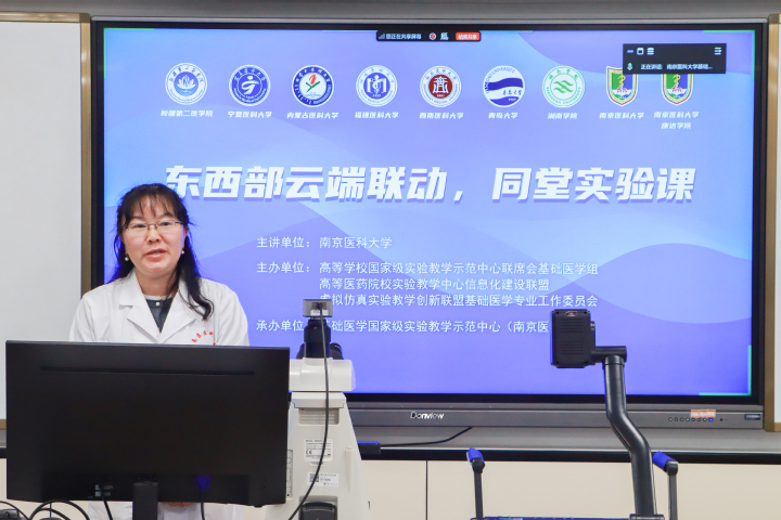 为持续推动医学实验教学数字化改革、促进东西部高校优质资源共享,由高等学校国家级实验教学示范中心联席会、高等医药院校实验教学中心信息化建设联盟、虚拟仿真实验教学创新联盟基础医学专业工作委员会联合主办,南京医科大学承办的“东西部云端联动,同堂实验课”教学活动(第六期)11月18日顺利举行。本次活动汇聚来自南京医科大学、新疆第二医学院、宁夏医科大学、内蒙古医科大学、福建医科大学、西南医科大学、南京医科大学康达学院、青岛大学医学院、湘南学院等九所高等院校240余名师生共同参加,通过云端同堂的方式共同开展组织胚胎学实验课程。学校党委常委、副校长沈历宗教授出席活动并致辞。活动由高等医药院校实验教学中心信息化建设联盟秘书长、基础医学院院长助理陈园园教授主持。