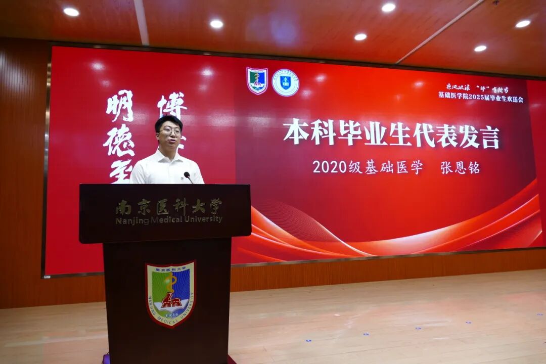 2020级基础医学专业张恩铭同学作为本科毕业生代表发言,他分享了求学路上的收获与感悟,表达了对未来的憧憬与决心,感谢老师与同学的陪伴和支持,并向母校和老师致以真诚美好的祝福。