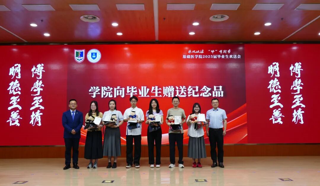 为表达学院对基础学子的祝福,学院为每位毕业生准备了一套定制学位服和学位熊玩偶,以及刘文涛老师研发的护手霜。吴文明副院长、刘文涛老师向毕业生代表赠送纪念品,祝福毕业生们前程似锦,鹏程万里。