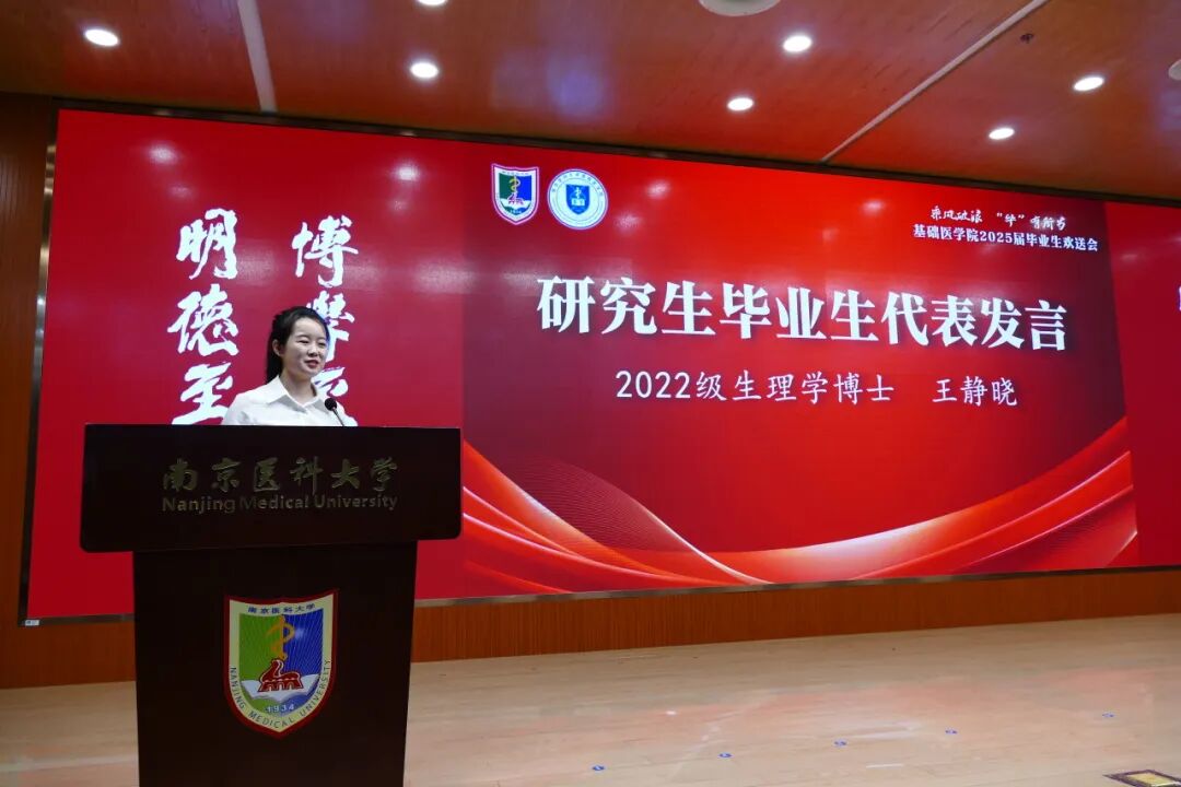 2022级生理学博士生王静晓同学作为研究生毕业代表发言,她分享了自己从入学到毕业的学习感悟,讲述了在科研探索中的收获、个人的成长与蜕变,表达了传承“博学至精,明德至善”校训精神坚定前行的信心。