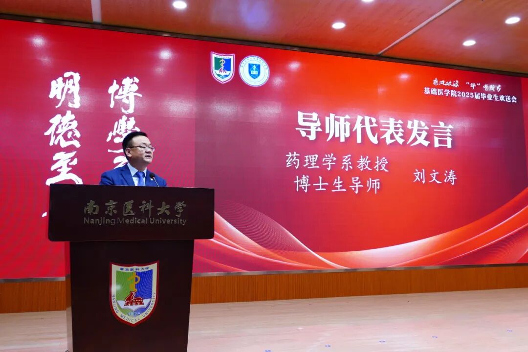 药理学系刘文涛教授作为导师代表深情发言,刘文涛老师分享了自己求学路上的心路历程,以“老师、学长、长辈”三个身份对毕业生深切寄语,他勉励同学们无惧失败,热爱真理,永葆求知热情。