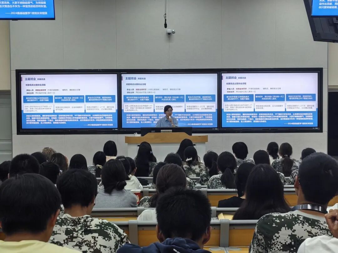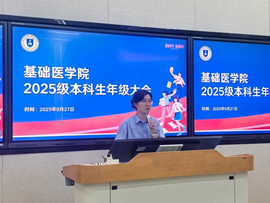 为引导新生尽快适应大学生活,确保国庆假期安全稳定,9月27日晚,基础医学院在第三阶梯教室召开2025级本科生年级大会。大会由辅导员范涵婷主持,全体2025级本科生参会。