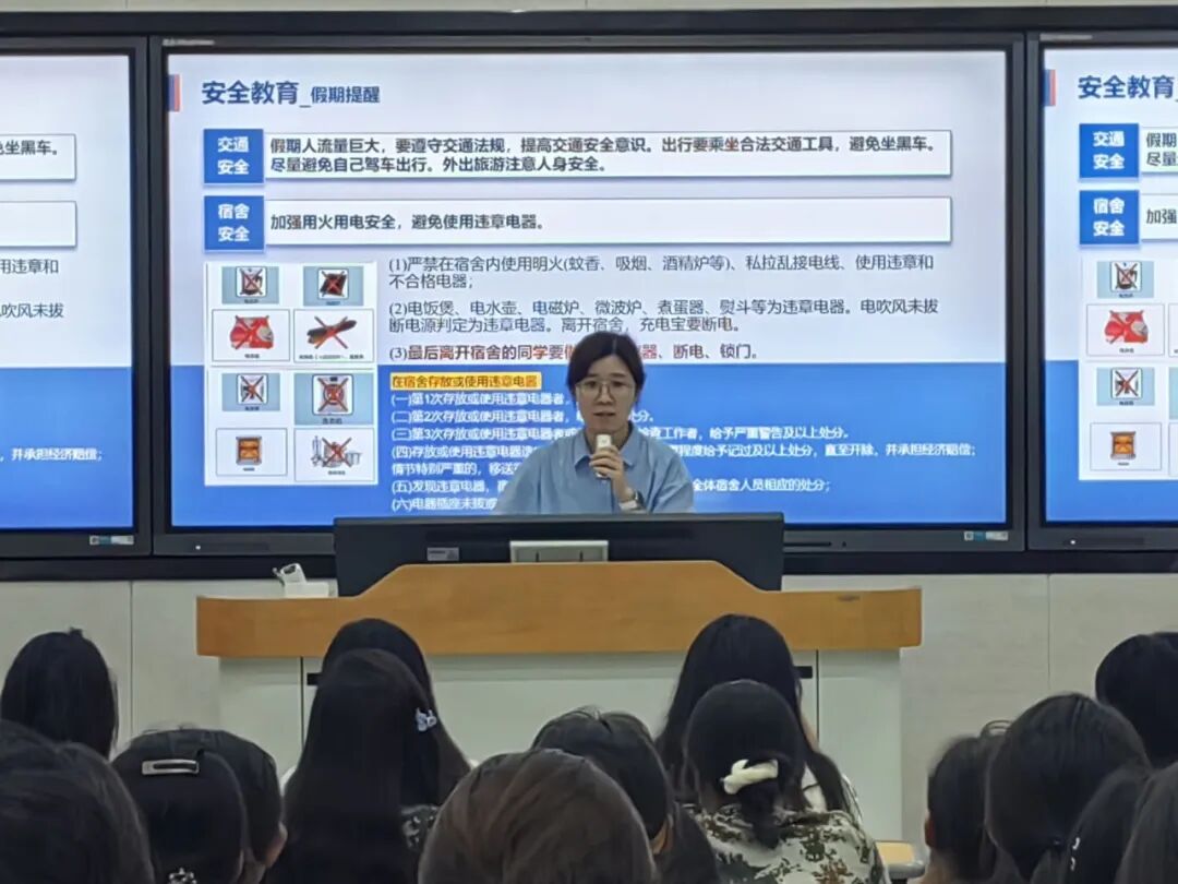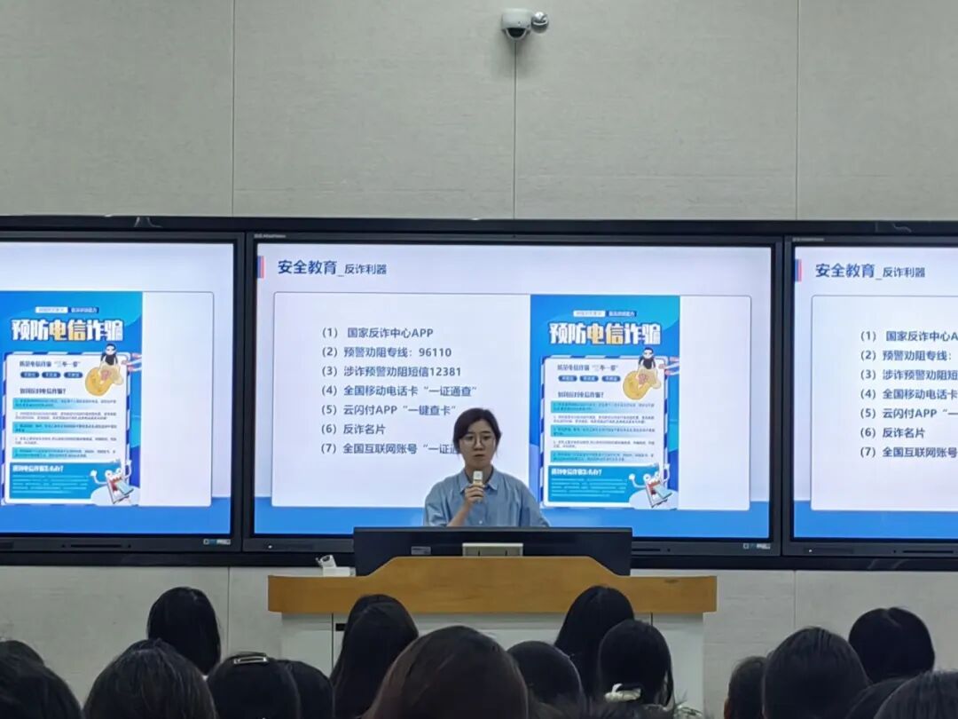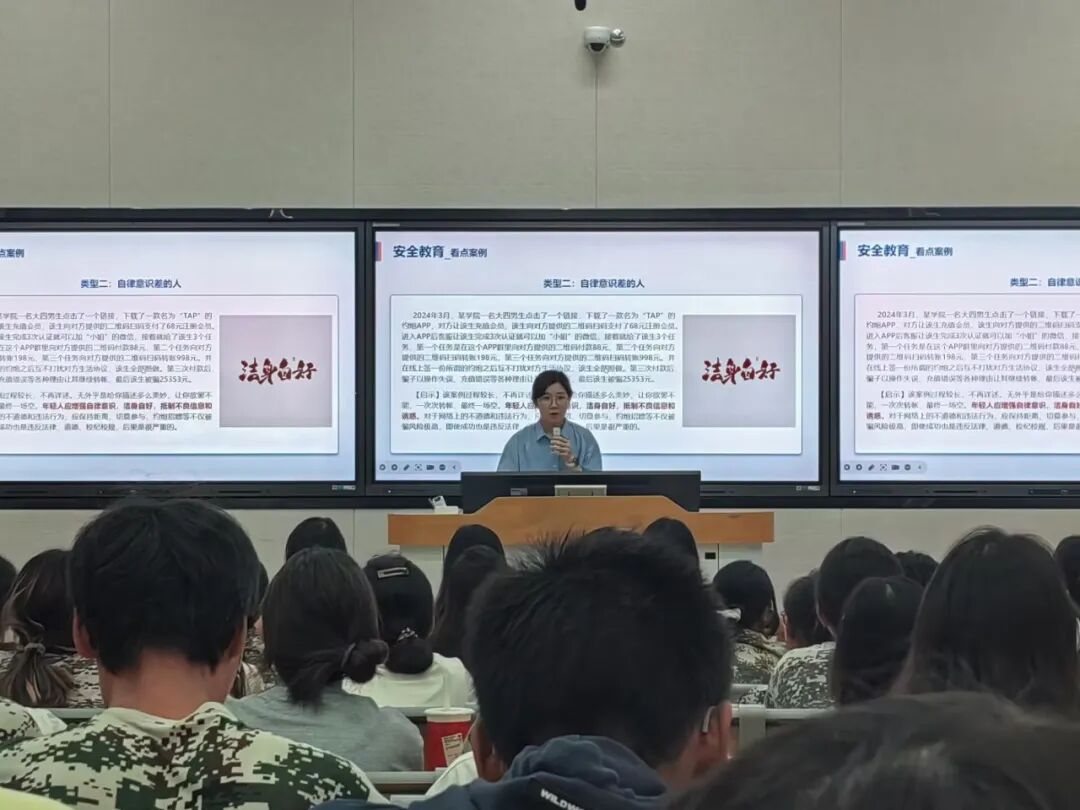 国庆长假即将来临,新生缺乏安全意识,缺少防诈防骗经验,针对常见的安全问题,范老师从多个维度进行了深入讲解。她提醒同学们出行务必选择正规交通工具,不要坐黑车或非法交通工具,尽量不要自行驾车出行,尽量避免前往人流密集区域,时刻保持警惕。关于宿舍安全,她强调离开宿舍须做到“人走电断、门窗锁闭”,并明确要求禁止使用各类违禁电器,共同维护安全、和谐的住宿环境。