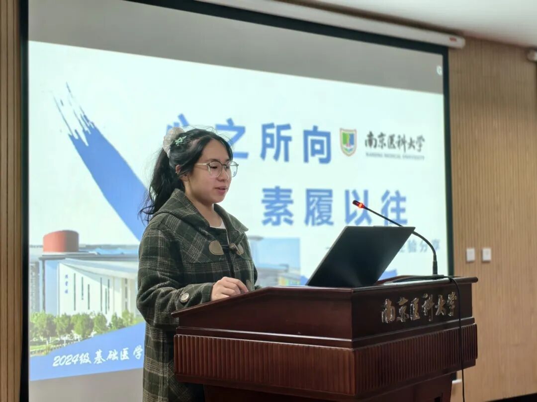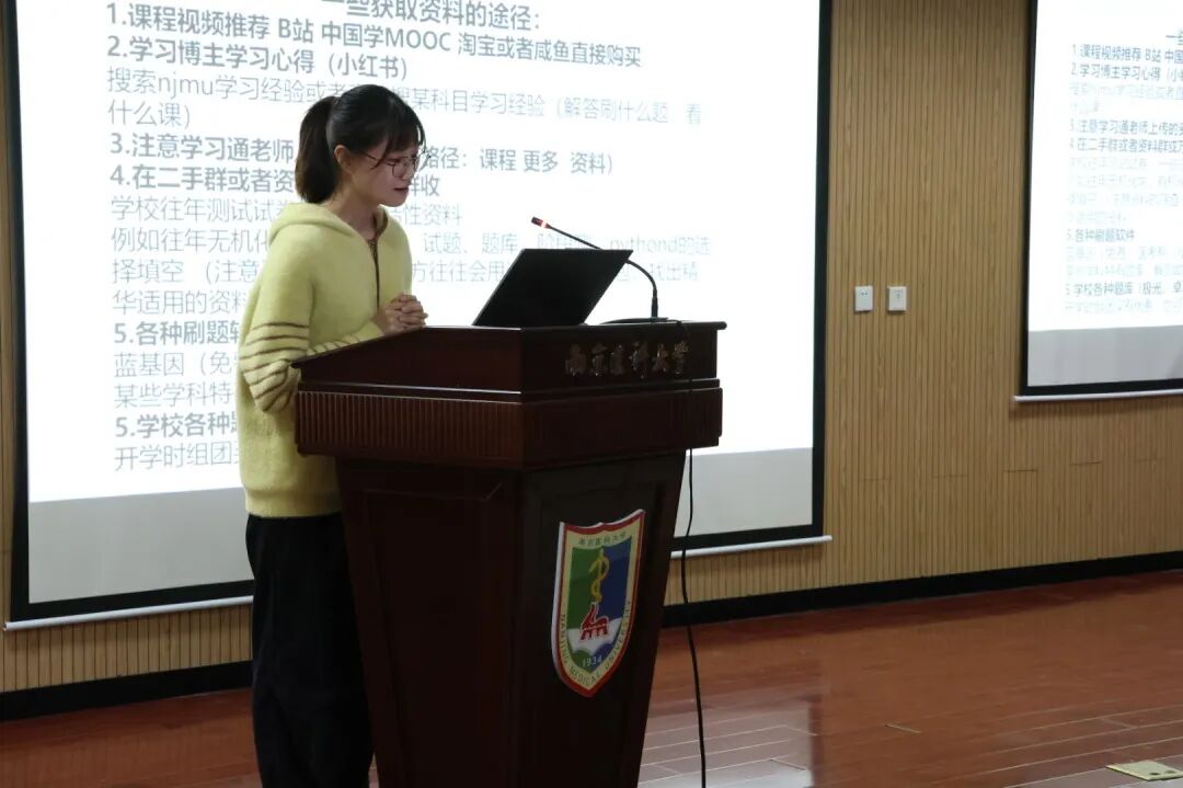 最后发言的是2023级基础医学专业的韩佳慧同学。她从学习的前期准备,学习地点的选择以及坚定学习意志三个角度为同学们进行了详细的介绍,使同学们对学什么、去哪学和怎样学有了充分的认识。