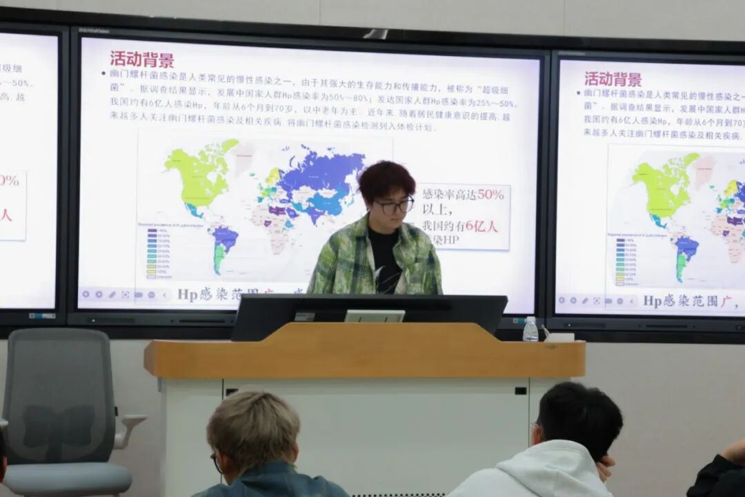 首先,由参加暑期社会实践团的范醴同学,以“医路逐光担重任,韶华笃行谱新篇”为主题,生动还原了团队暑期的实践历程。他详细讲述了团队深入两省五市十多个社区展开幽门螺旋杆菌秘密的分享旅程、健康科普之路的点滴,从与南京梅园新村街道团工委和梅园新村退役军人服务站合作,到在当地暑托班开展幽门螺旋杆菌、眼睛耳朵与中暑溺水急救课程,“三下乡”之旅的每一个细节都饱含着对基层医疗服务的热忱。范醴同学还分享了与捐友老师对话,制作扭扭棒花束等手工艺品,均深刻诠释了“让医学走进千家万户,以实际行动守护群众健康”的理想信念,让在场新生深受触动。