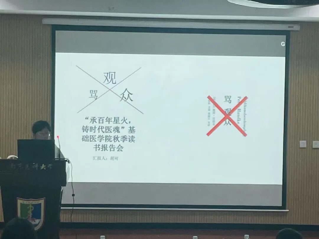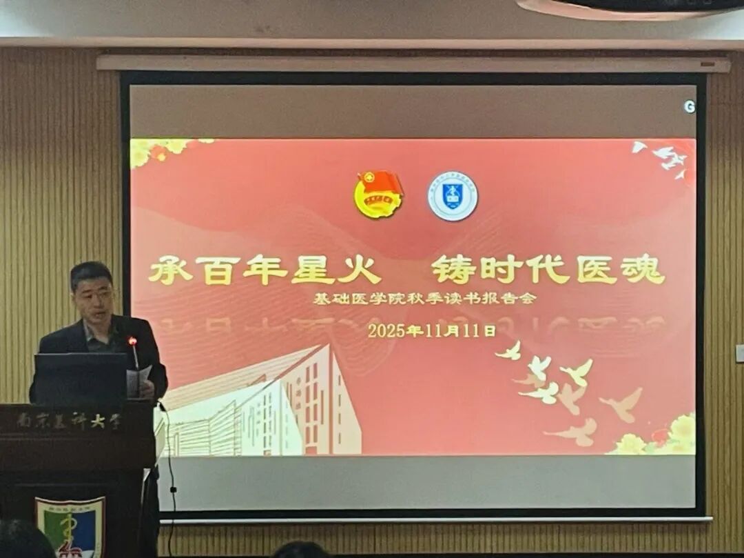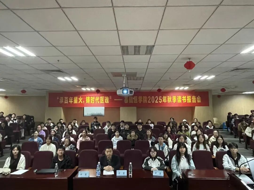 1月11日晚,基础医学院“‘承百年星火,铸时代医魂’2025秋季读书报告会”在学海楼D001举行。基础医学院段振东副书记及部分本研同学参加了本次读书报告会。报告会由张津铭同学主持。
