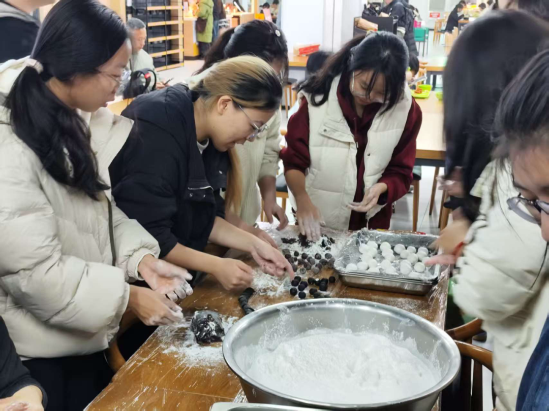 揉捏搓转间,是手心传来的温度;谈笑风生中,是心灵相通的暖意。在食堂师傅的悉心指导下,同学们开启了汤圆制作初体验。从小心翼翼调配糯米粉与清水的比例,到专注地包裹馅料,再到轻轻揉搓成团,每个步骤都充满新奇与期待。当一颗颗圆润的汤圆在掌心诞生,有标准浑圆的“优等生”,也有憨态可掬的“创意款”,每一颗都承载着对团圆最真挚的期许。