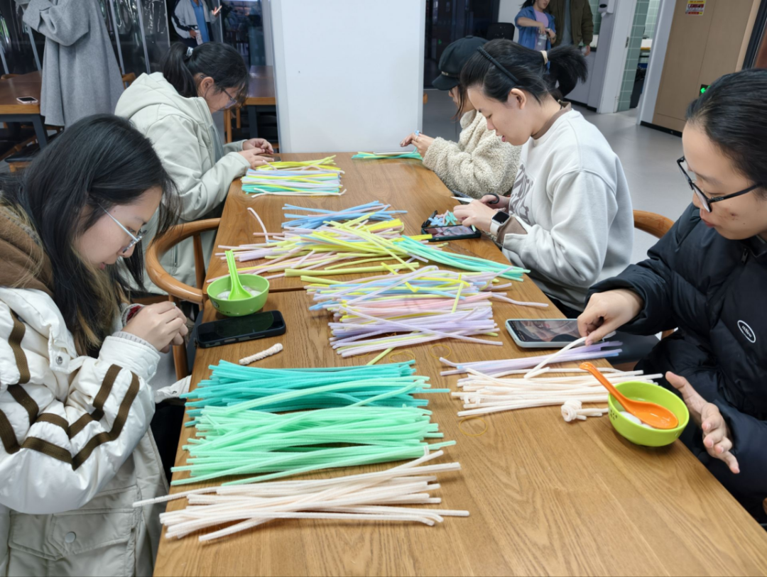 等待汤圆出锅的时光,被彩色扭扭棒装点得格外绚烂。原本普通的材料在指尖翻飞、缠绕,渐渐绽放成独一无二的创意烟花。有同学精心设计配色,有同学巧妙构思造型,专注的神情与灵巧的动作相映成趣。当一件件充满想象力又独一无二的作品在手中诞生,惊喜的笑声此起彼伏。