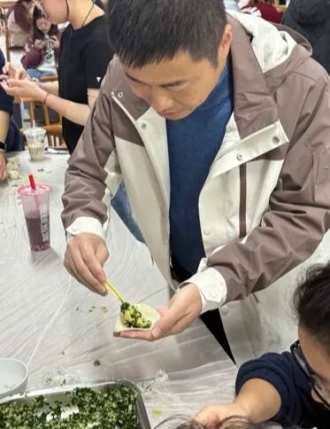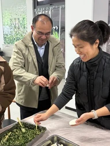 学院段振东副书记与辅导员马妮娜老师受邀加入本次活动,为这场冬日之约注入了满满的温情。段书记穿梭于各小组之间,一边示范包饺子的技巧,一边亲切问候同学们的课题进展与生活近况,幽默的点评更引得笑声连连,让现场氛围轻松而温暖。马妮娜老师则细致关注每位同学的情绪,主动坐到沉默者身旁,一边帮忙整理饺子的边角,一边轻声交流学业与生活。当一位同学因饺子皮破损而沮丧时,她温柔鼓励:“科研也像包饺子,第一次不完美很正常”,简单话语传递出包容与理解。