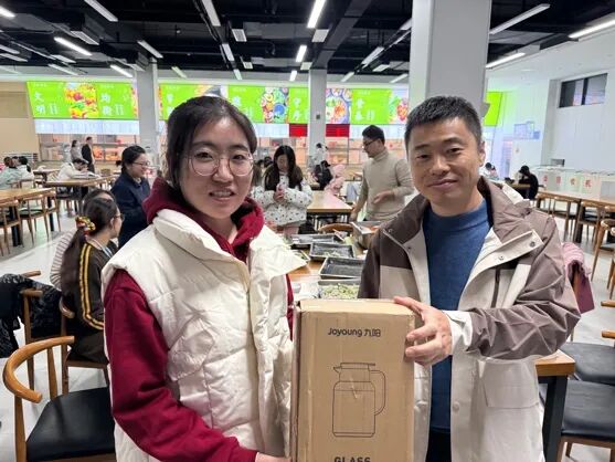 包饺子大赛将气氛推向高潮。各组同学分工明确、动作迅捷,饺子如雪片般落满餐盘。激烈的包饺子大赛圆满收官!十支队伍高手过招,最终,两支队伍凭借超高的饺子“颜值”征服全场,三支队伍则以绝对“产量”胜出,拿到“红围裙奖”,获得了与书记合影的福利,并抱回了保温杯、零食礼包等惊喜奖励。当然,到场的每一位同学都不会空手而归,人人都有活动分和精美的纪念品相伴,真正是乘兴而来,尽兴而归。