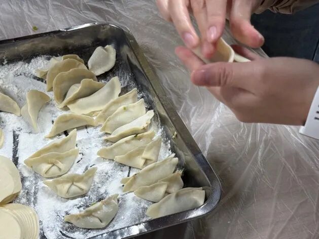 活动现场,一张张柔韧的饺子皮在指尖流转。同学们四人一桌,巧手翻飞——取皮、填馅、蘸水、捏合,动作从生涩到熟练,饺子从“奇形怪状”到“有模有样”。月牙饺、元宝饺、柳叶饺……形态各异的饺子在托盘上列队,也记录下每个人专注而放松的瞬间。没有复杂的揉面擀皮,却让每个人都在简单重复的手作中,找到了久违的心流体验。