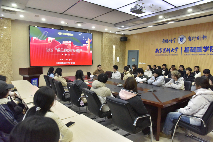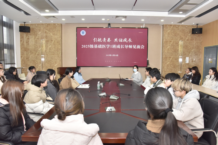12月26日,校党委徐珊副书记走进我院,作为本科生成长导师与我院2025级基础医学1班全体同学亲切交流,共话成长。校党委宣传部副部长赵春华、学院党委副书记副院长段振东、院学工办主任张凡一同参加本次见面会活动。活动由辅导员范涵婷主持。
