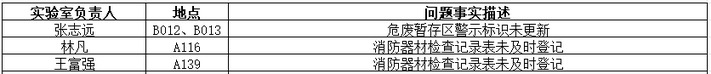 12月学院对各学系、中心实验室及学生学习室进行安全检查,多数学系、中心实验室安全状况良好,但部分实验室存在危废暂存区警示标识未更新、消防器材检查记录表未及时登记等问题,现将具体情况通报如下:
