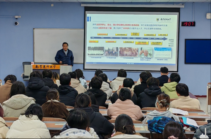 首先,法医学系教工党支部书记李开向大家详细介绍了我校法医学系的发展情况,从法医学社会价值和定位、学科属性、研究内容,到我校法医学科文化传承和精神内涵建设、人才培养、团队发展、科学研究和社会服务等方面,向同学们进行了详细介绍,让大家更加深入了解法医学专业的价值,帮助大家牢固树立爱岗敬业、维护公正、勇于探索的职业精神。同时,他还希望大家不断拓展视野,紧盯前沿科学技术,融入法医专业学习和创新当中,做未来法医发展的引领者,努力做新时代国家法治建设需要的卓越法医人才。