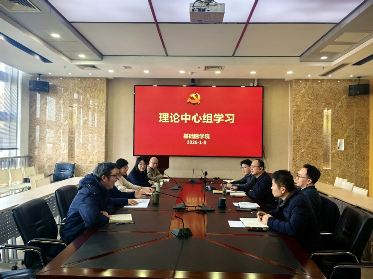 2026年1月8日,基础医学院理论学习中心组召开专题学习会,集中学习研讨《国家主席习近平发表二〇二六年新年贺词》。学院党委书记陈峰主持会议并领学,中心组成员参加学习并交流发言。
