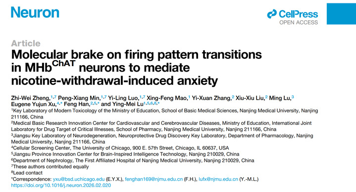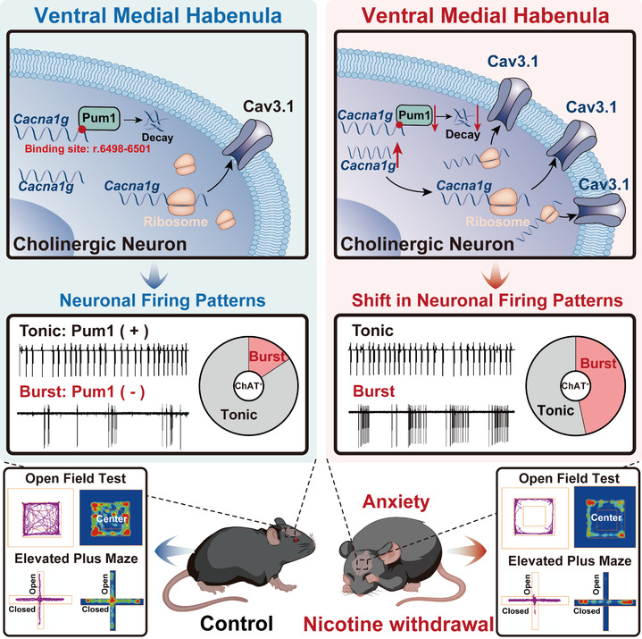 近日,南京医科大学卢应梅、韩峰教授团队联合美国芝加哥大学徐宇君教授在神经元(Neuron)杂志上发表了题为“Molecular brake on firing pattern transitions in MHbChAT neurons to mediate nicotine withdrawal-induced anxiety”的研究成果。该研究以内侧缰核为切入点,围绕焦虑障碍的电生理与分子机制开展系统研究。研究发现,内侧缰核腹侧区域乙酰胆碱能(vMHbChAT)神经元的放电模式发生显著转变,这一变化在焦虑行为的产生中发挥关键作用。进一步机制研究表明,RNA结合蛋白Pum1通过调控T型钙通道CaV3.1的表达,参与调节神经元放电模式,从而介导焦虑情绪的发生。本研究从神经元放电模式的角度深化了对焦虑发生机制的认识,并为靶向神经电活动调控的精准干预策略提供了新的理论依据和潜在靶点。